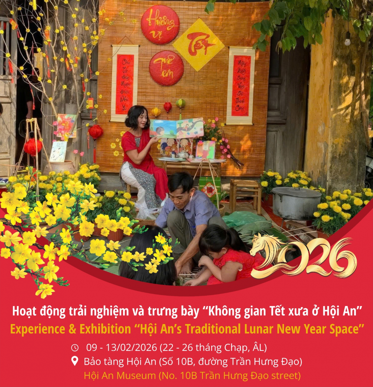 Hoạt động trải nghiệm và trưng bày “Không gian Tết xưa ở Hội An”diễn ra từ ngày 09 - 13/02/2026 (nhằm ngày 22 - 26 tháng Chạp âm lịch) tại Bảo tàng Hội An tái hiện không gian chợ Tết xưa với các gian hàng trưng bày, các hoạt động trình diễn làm các loại bánh, mứt cổ truyền, thưởng trà, viết thư pháp, trải nghiệm đi chợ theo cách người xưa, làm lồng đèn, vẽ mặt nạ, thưởng thức ẩm thực, tham gia các trò chơi dân gian,... Thông qua hoạt động góp phần bảo tồn và phát huy giá trị đặc trưng trong phong tục, tập quán của người Hội An.