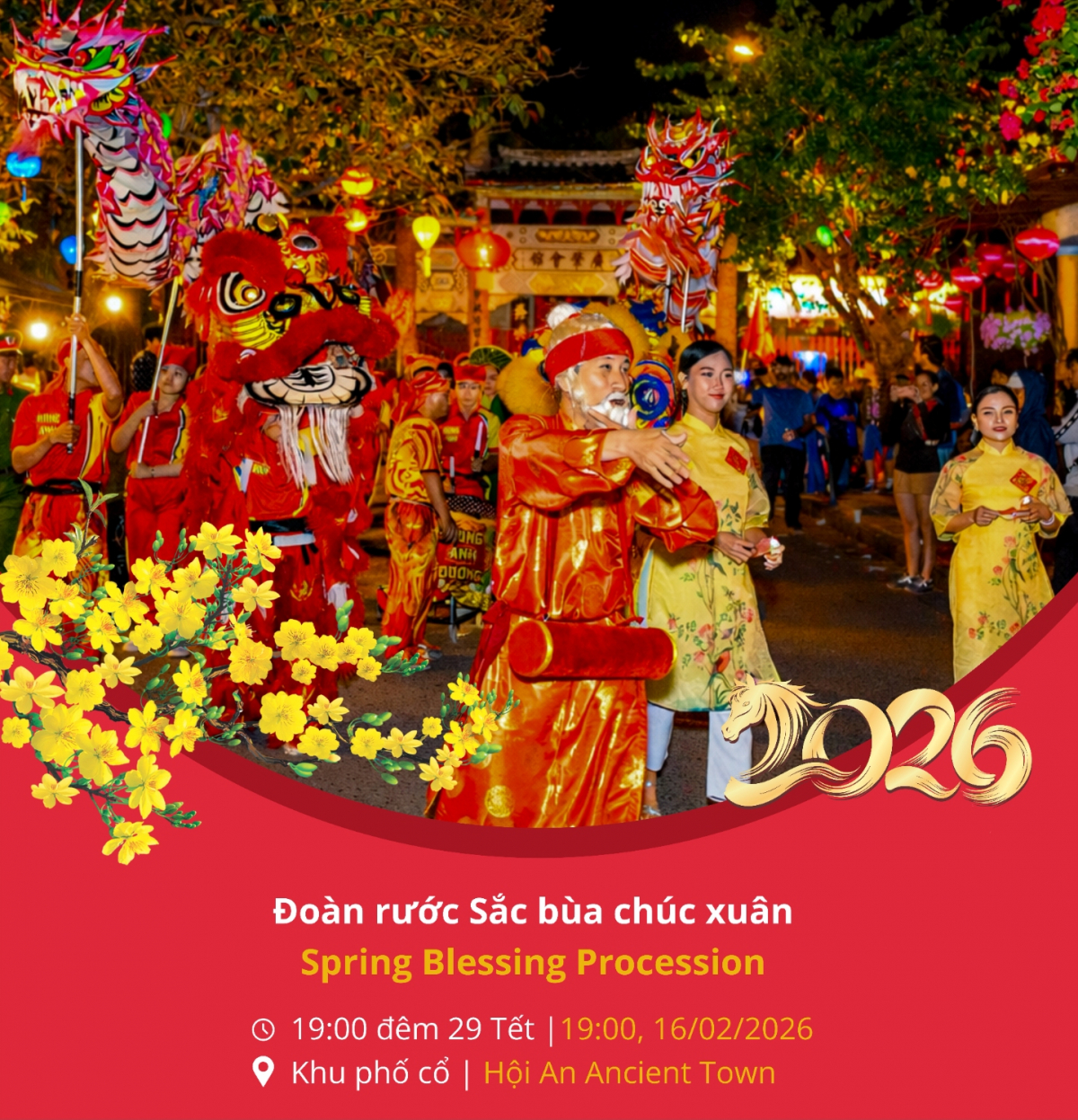 Trong đêm 29 Tết, tại Khu phố cổ, đoàn rước Sắc bùa chúc xuân với các nghệ sĩ hát múa sắc bùa, đội bát âm, thiên cẩu sẽ diễu hành và tặng xuân liên cho người dân và du khách hứa hẹn lan tỏa không khí vui tươi, may mắn, cầu chúc một năm mới an lành đến từng tuyến phố. Tiếp theo đó, tại Công viên Hội An, chương trình nghệ thuật đón Giao thừa với các tiết mục ca ngợi quê hương, đất nước, mừng Đảng, mừng Xuân sẽ tạo nên khoảnh khắc chuyển giao giữa năm cũ và năm mới trang trọng, ấm áp và giàu cảm xúc.