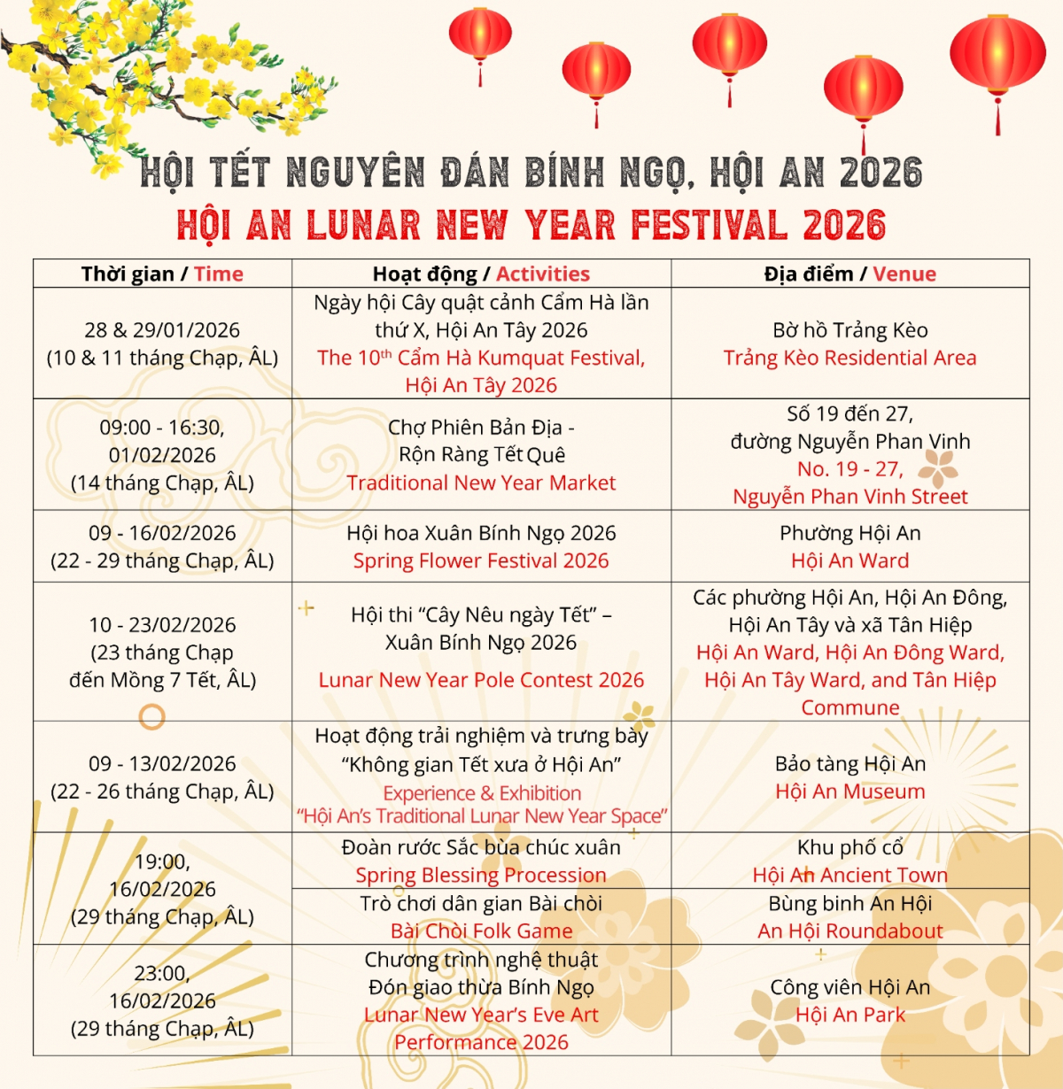 Tiếp nối mạch sinh hoạt văn hóa trong dịp đầu năm mới, Hội Tết Nguyên Tiêu Bính Ngọ 2026 sẽ diễn ra từ ngày 02 - 04/3/2026 (nhằm ngày 14 - 16 tháng Giêng âm lịch), tại Khu phố cổ và các địa phương lân cận. Với sự chú trọng vào các hoạt động sinh hoạt cộng đồng, tín ngưỡng, tâm linh đặc trưng, sự kiện góp phần bảo tồn và phát huy Di sản văn hóa phi vật thể quốc gia Tết Nguyên Tiêu tại Hội An; đồng thời, khẳng định chiều sâu văn hóa và đời sống tinh thần phong phú của cư dân đô thị cổ.